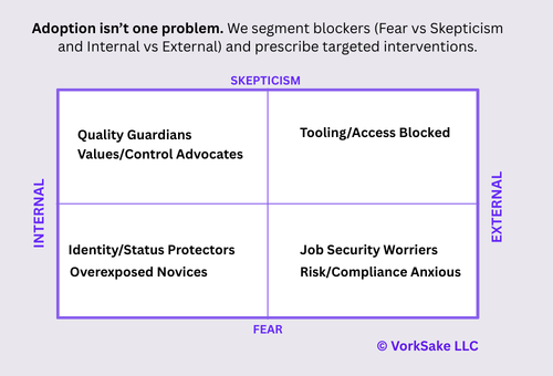 Through our research, we’ve identified 8 distinct patterns of AI resistance. Each one requires different interventions: